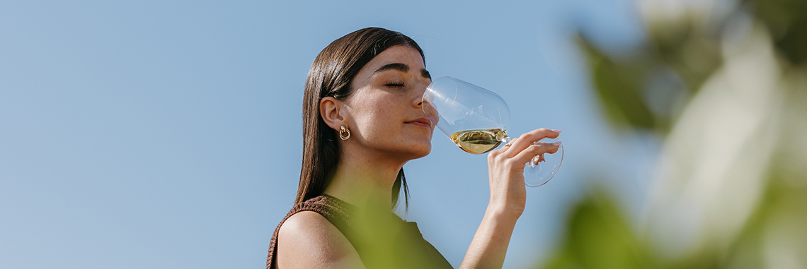 Disfrutando de un vino blanco de Familia Torres al aire libre: frescura, ligereza y elegancia en cada sorbo.
