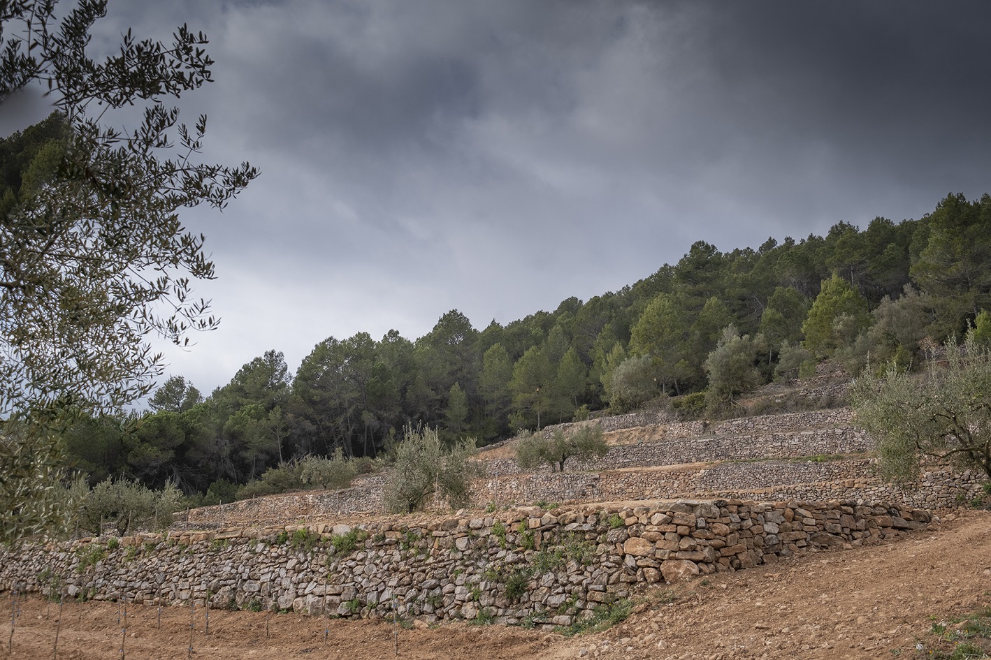 The vineyard will be dedicated exclusively to Forcada, an ancestral white variety recovered by Familia Torres. The south-facing terraces climb up to an elevation of 700 meters and are presided over by a well-preserved barraca, a small dry-stone structure often found in old vineyards. What makes this site so special are its 25 consecutive terraces with dry stone walls. The lower terraces – still cultivated up to the present – have been replanted with Forcada vines trained in the traditional Gobelet style. The process preserved the existing olive trees, characteristic of the Mediterranean landscape, and restored the dry-stone walls. The restoration of the upper terraces will proceed gradually during the course of this project, which is anticipated to take approximately three years.